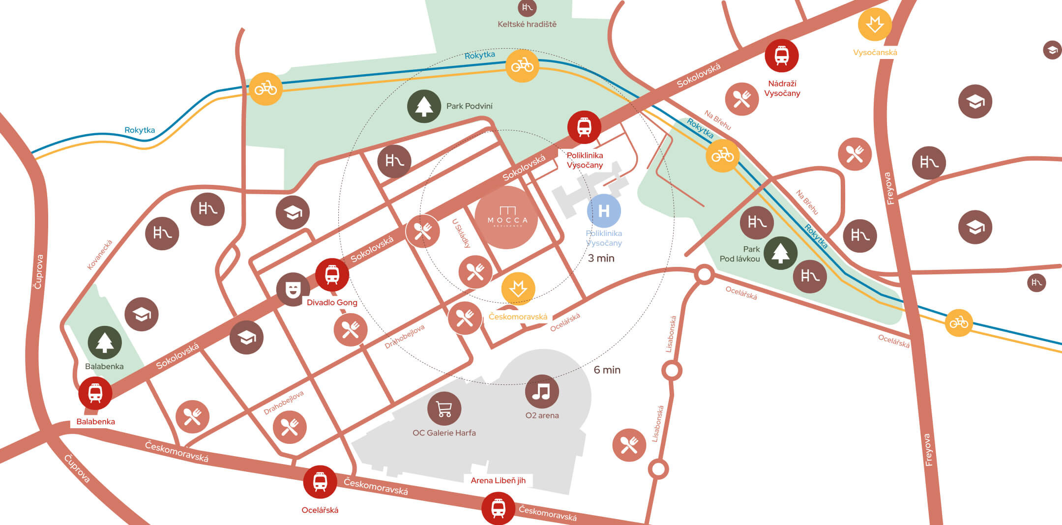 Discover a dynamic district where the industrial past meets the modern lifestyle. Vysočany will charm you with its unique atmosphere, combining a rich history and sensitive transformation. MOCCA is only a three-minute walk from the Českomoravská metro station, which ensures excellent transport access to the center and other parts of the city.